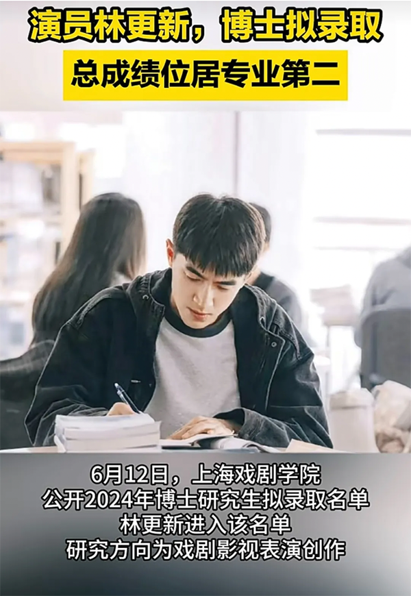 此前,演员林更新参加上海戏剧学院2024年博士研究生(申请-考核制)复试的消息也引发广泛关注。6月12日,2024年上海戏剧学院博士生研究生拟录取名单公布,林更新位列其中,名单显示,林更新报考的研究方向为戏剧影视表演创作,该专业共录取4人,林更新以277.05分的总成绩位居专业第二。