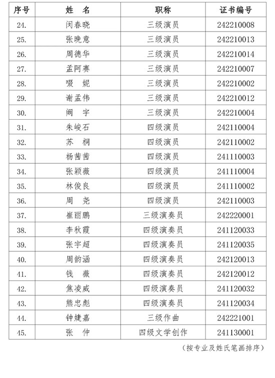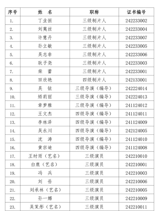 日前,2024年度艺术系列初、中级职称评审工作已经结束。文艺两新人才由中广联合会电视制片委员会、电视剧导演委员会、演员委员会等单位申报,北京中广联人才服务有限公司申报指导提供人才服务。经国家广播电视总局广播影视人才交流中心专业技术职务评审委员会集中评审,45位文艺两新人才通过了艺术系列初、中级专业技术职务评审。名单如下: