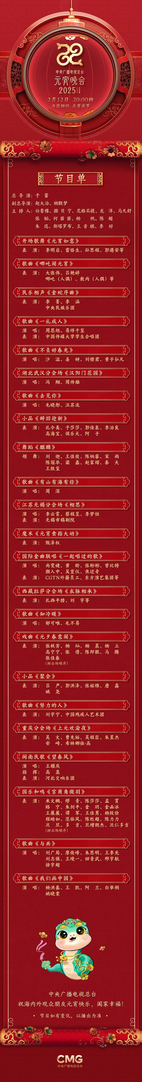 花灯映月圆,万家共此时!中央广播电视总台《2025年元宵晚会》将于2月12日晚8点档与海内外观众见面。晚会在“欢乐吉祥、喜气洋洋”的总基调中,通过歌曲、舞蹈、相声、小品、戏曲、魔术等各类型的节目,呈上一席兼具传统意蕴与现代活力的团圆家宴,与全球观众共度上元之夜。