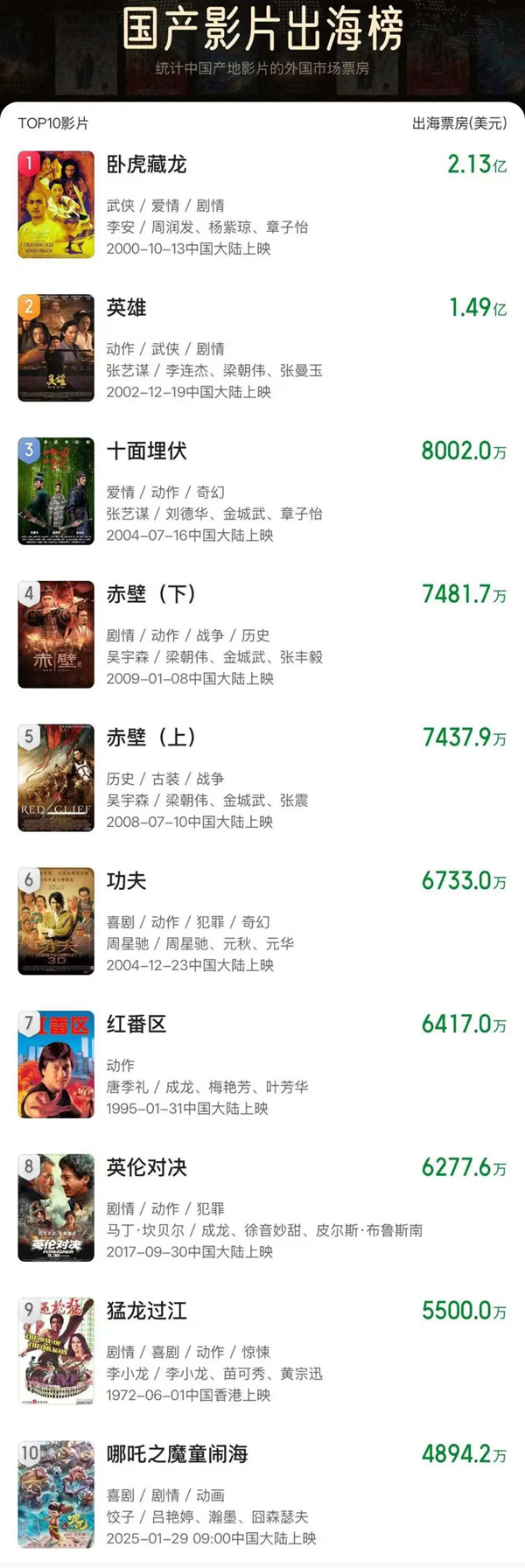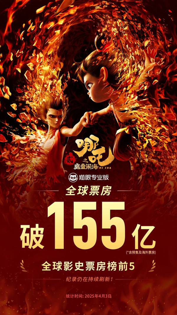 据网络平台数据,《哪吒之魔童闹海》截至当前全球累计票房已达155亿,暂列全球影史票房榜前5!出海票房超4894.2万美元,冲进国产电影出海榜前十!