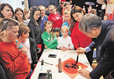 2月,俄罗斯中小学师生在莫斯科观看中国书法展示。人民日报记者 于宏建摄
