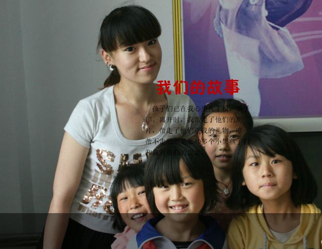 (张) 孩子们总会在不经意间为我留下难忘的感动。“六一”的时候我送给他们橡皮擦作为小礼物,他们都望着我不说话。我以为他们害羞,不好意思,但是谁知道晚上快要熄灯的时候他们满头大汗的跑来,手上抱着一只毛绒小熊,其他什么也说不出来,只挤出一句:“老师,这个送给你”便跑了,我呆呆的愣了半天,我不知道他们这么晚在前不着村后不着店的国道上去哪里买的小熊,也不知道他们每个人究竟凑了多少钱,我只知道这些孩子是那么善良,那么淳朴,你对他们一分好他们会用十分来回报你,面对他们这样的质朴和热情,我总会为自己微薄的力量而感到不安。这三个月里虽然我的嗓子经常哑着;舞蹈鞋也渐渐变的破损;房间里到处都是孩子们制作的小礼物;手机、电脑里和他们的照片都快满的放不下了,可是我还想继续高喊着“五六七八”;还想给孩子们示范动作;还想看她们送我折纸千纸鹤、小船、桃心时甜甜的表情,这才意识到这些孩子们已在我心里扎了根,烙了印。离开时,我带走了他们的照片,带走了他们送我的礼物,唯一带不走的却是那40多个小黑燕子和我对他们的思念。孩子们排着队送我上车时一个个哭成了小泪人,我尽量表现的坚强,但是此刻的我却早已泣不成声了。