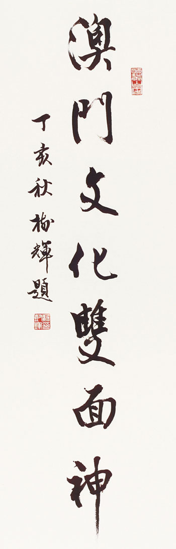 在多次书展中,最有意思的是“澳门文化双面神”书法展。此展内容多为澳门历史上不同年代、不同诗人吟咏澳门的诗词,涉及文化交融、宗教历史、风土人情等。苏树辉书有“圣德齐天恩流镜海 母仪称后泽沛莲峰”,妈祖为中国沿海居民信仰之一,在澳门民间信仰中占有重要地位,因闽商航海贸易之需将妈祖神像奉迎于澳门以求庇佑航运顺利。苏树辉说举办这个书法展的目的正是希望通过诗词和书法两种风格各异的艺术形式,表现澳门独特的文化气质和魅力形象。