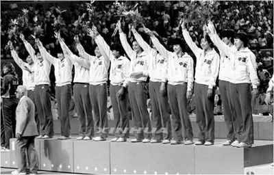 1984年8月7日,中国女排在第23届奥运会女排决赛中,以3比0战胜美国队,实现“三连冠”。这是中国队员在领奖台上向观众招手致意