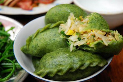 清明果形状有些像饺子,但味却截然不同。清明果的皮是一种叫艾叶的植物做成的,艾,多年生草本植物,开黄色小花,叶小形如菊科植物,生得一篷篷,一簇簇的。每年清明前,女人们手提竹蓝,三五成群来到田野喜滋滋地采摘艾叶,青青鲜鲜的艾叶满满当当地堆在蓝子里,煞是好看诱人。艾叶采回家后,便开始了繁杂的制作清明果的工序,女人们又像摩术师,青青的艾草一转眼就变成美味可口的清明果了。