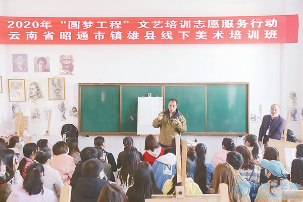 自2017年开始,在中央文明办的大力支持下,中国文联文艺志愿服务中心依托各省级文联招募文艺家和文艺工作者作为文艺志愿者,重点面向全国832个贫困县的乡村学校、少年宫艺术辅导员和农村一线艺术教师,开展以音乐、舞蹈、美术、书法、手工艺等课程为主的“圆梦工程”文艺培训志愿服务行动,以提升教师专业水平和艺术素养。2020年,突发的新冠肺炎疫情给线下培训带来了前所未有的冲击和挑战,中国文联文艺志愿服务中心创新工作方式和方法,结合“文艺扶贫奔小康”战略部署,精心设计,将线上培训作为突破口,以线上和线下相结合的方式,在变局中开新局,打出了文艺培训的“一手好牌”。几年来,共有600多位文艺志愿者参与,线下培训学员1.5万余人次,线上受益学员40万余人次,直接受益学生达200万名。