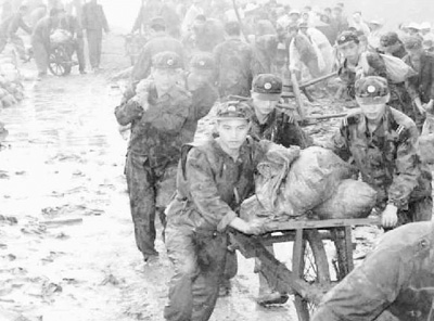 1998年7月,为确保荆江大堤的安全,数千名解放军官兵以惊人的毅力坚守在大堤上,排除决堤险情。图为战士们运送袋装沙石加固大堤。 新华社记者 李 刚摄