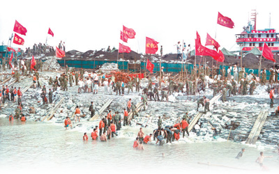 1998年8月15日,抗洪官兵在加固长江大堤九江城防堤。 燕 平摄(人民视觉)