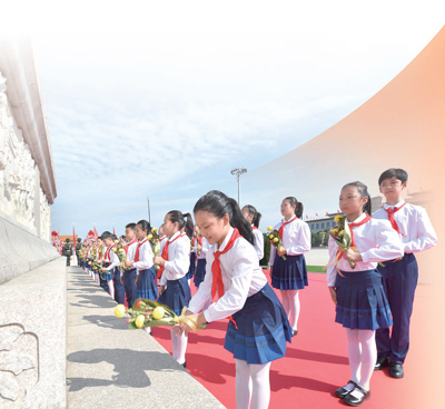 9月30日下午6时,会议全体代表到天安门广场举行人民英雄纪念碑奠基典礼。代表们一一执锨铲土,表达对先烈的崇敬。