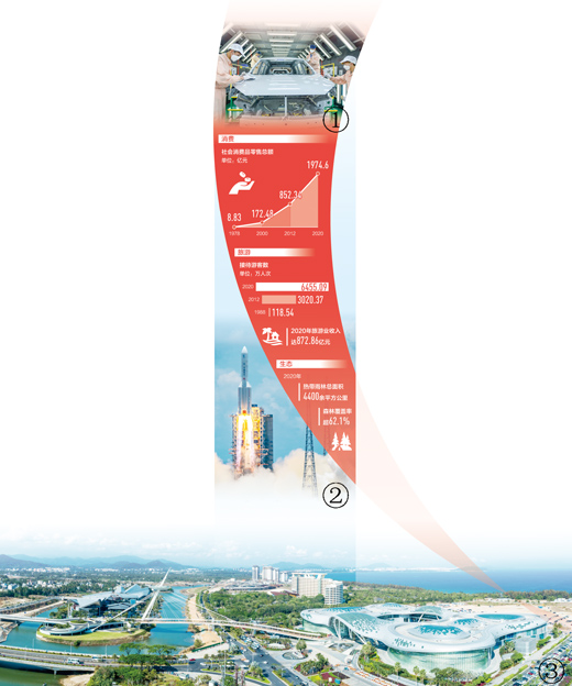 全面贯彻新发展理念,发展质量显著提升。在房地产调控、疫情影响和政策性财政减收等三重压力下,持续奏响练内功、转动能、引外力“经济转型三部曲”。在练内功上,以壮士断腕决心摆脱经济对房地产业的依赖,产业投资占比从不到40%上升至超过60%,经济增速超过全国平均水平,成功走出转型“阵痛期”。在转动能上,加快建立“3+1”现代产业体系,做好吸引境外高端购物、医疗和教育等三篇消费回流文章。成功举办首届中国国际消费品博览会,向世界展示了中国消费市场的巨大潜力。打造“陆海空”三大未来产业,“南繁硅谷”建设取得实质性进展,崖州湾种子实验室挂牌成立。在引外力上,着力引进外资和央企到海南投资兴业,实际利用外资连续3年翻番,央企及央企子公司在琼营业收入与2018年相比增长超20倍。去年主要经济指标好于全国平均水平,新设企业、引进人才、离岛免税购物等指标均实现翻番。今年一季度,全省地区生产总值同比增长19.8%,两年平均增速7%,增速均位列全国第二,固定资产投资同比增长20.3%,社会消费品零售总额同比增长61.6%,经济在恢复性增长中实现“开门红”。