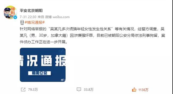 北京市公安局朝阳分局通报“吴某凡”涉嫌强奸罪,被依法刑事拘留。