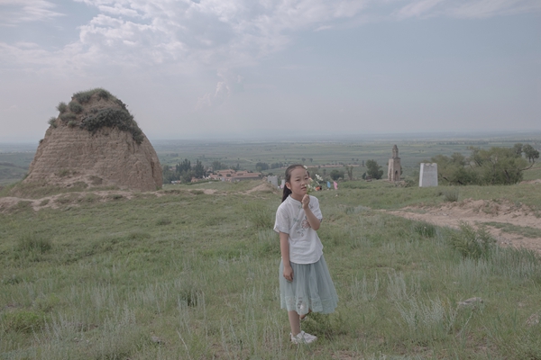 居住在长城边的人——一个女孩在长城遗址和八台遗址前。大同市 梁伟宏 摄