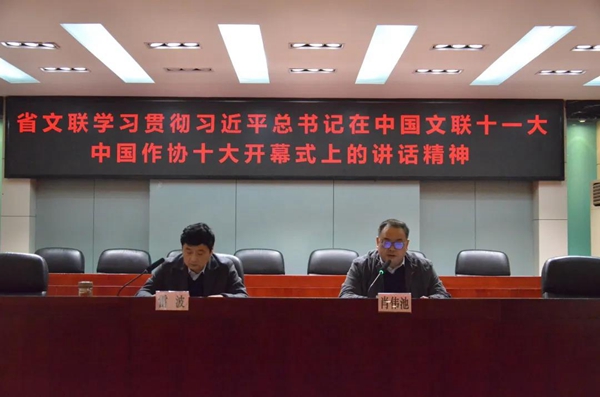 12月16日上午,省文联召开全体干部职工大会,集中传达学习习近平总书记在中国文联十一大、中国作协十大开幕式上的重要讲话精神。受在京参会的党组书记、常务副主席邓长青同志委托,党组成员、副主席、一级巡视员肖伟池同志主持会议。