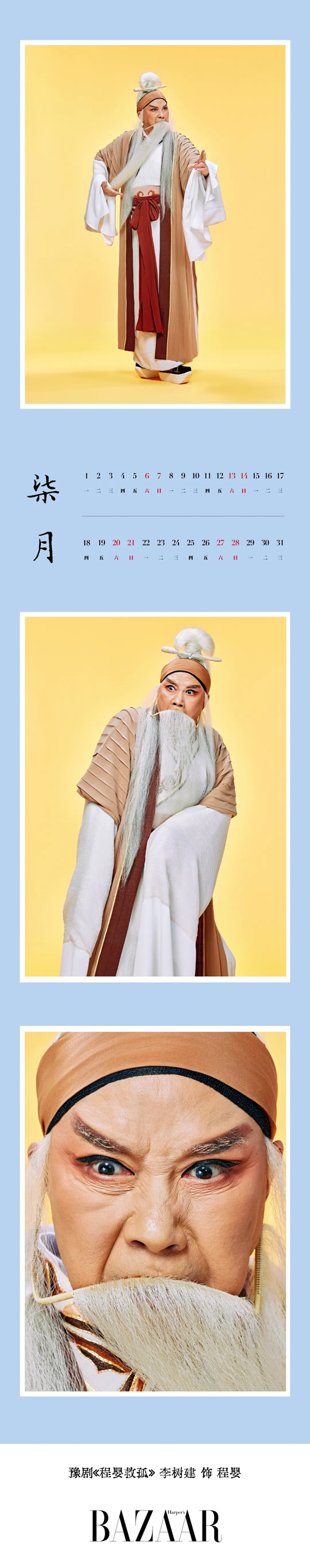李树建饰演豫剧《程婴救孤》中的程婴,该剧改编于元杂剧《赵氏孤儿》,并在此基础上编排成一部更为壮烈的悲剧。本次拍摄为程婴养育赵孤成人后的造型。此时的程婴已含垢忍辱十六年,期间面临救孤之险、育孤之艰、失子之痛、丧妻之悲……多年来被万人唾弃的屈辱,被千夫所指的痛苦,均将程婴搓磨得老态龙钟,但即便如此,其不畏强权、维护正义、坚韧顽强的形象,依旧熠熠生辉。