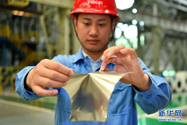 太钢集团员工在展示用手撕开0.02毫米厚的超薄带状不锈钢(2019年5月24日摄)。新华社记者 曹阳 摄