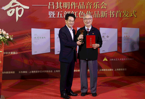 为庆祝中国共产党第二十次全国代表大会胜利召开,“使命——吕其明作品音乐会暨五部红色作品新书首发式”于2022年10月17日在上海交响乐团音乐厅成功举办。此活动由中共上海市委宣传部指导,上海市文学艺术界联合会、上海世纪出版集团主办,上海音乐家协会、上海音乐出版社、上海爱乐乐团承办。
