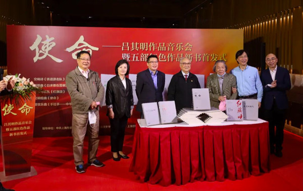 当晚6时30分,由吕其明创作、上海音乐出版社出版的“红色作品五部曲”——钢琴与乐队《红旗颂》(总谱版)、交响组曲《使命》、随想曲《白求恩在晋察冀》、管弦乐曲《手拉手——中华大家园》以及交响诗《铁道游击队》等五部新书首发式成功举行。