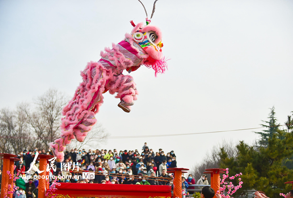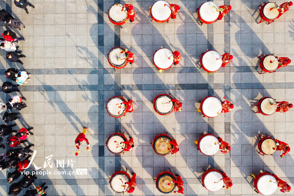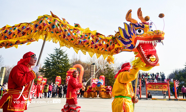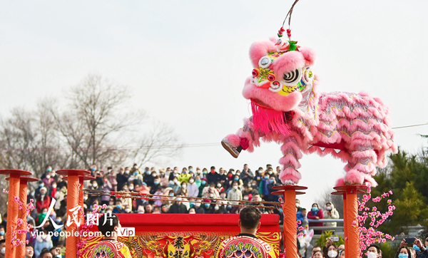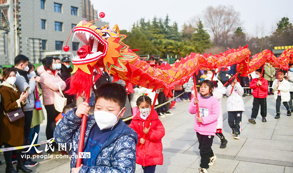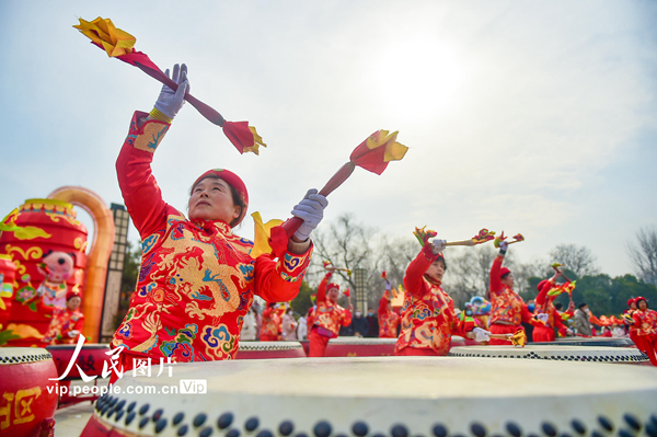 2023年1月22日,农历兔年大年初一,在河南省洛阳市隋唐城遗址植物园2023河洛文化庙会上,排鼓、舞龙舞狮等精彩的文化活动,热闹非凡,让市民体验欣赏传统民俗文化的独特魅力,热热闹闹过大年。黄政伟摄(人民图片网)