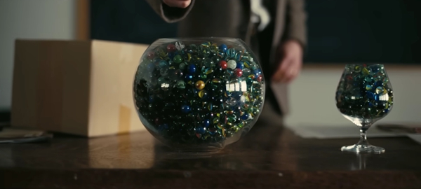 以《盗梦空间》为例,诺兰在展现入梦技术的时候,只设计了一个手提箱大小的装置,配以几个像输液管一样的装置。如果有比较硬核的科幻迷,可能会质疑这个装置的可行性,但诺兰通过塑造主角的困境以及整个任务的复杂程度,来吸引观众跟随主角的步伐去思考,反而忽略了设定的合理性。《奥本海默》也是如此。影片在介绍原子弹的原理以及各种装置的研发过程中,既没有回避具体内容,但也没有长篇累牍地去介绍,只在关键地方展示,之后也不再重复,因为诺兰的本意本就不是介绍整个曼哈顿计划的始末,或者把影片做成一个面向专业人士的教学影片。至于涉及到原子弹研发的进程,只通过玻璃珠的多少来表现研发进度,既直观,又通俗易懂。