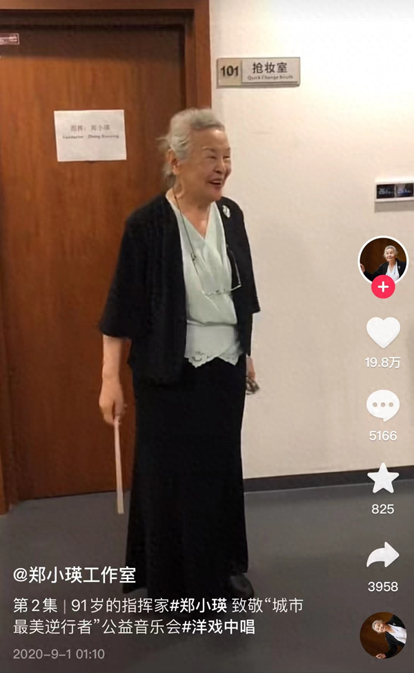 2020年6月,工作人员在账号发布了一小段花絮。那是在武汉“致敬城市最美逆行者”公益音乐会的后台,郑小瑛换装后走出化妆间,被夸赞“大美女出场”。她一边俏皮地回应“老太太了”,一边利落地走向舞台。没想到,这个视频意外地获得了500多万次播放、近20万点赞。