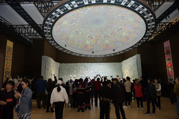 展位形象展示区设置展板介绍馆方基本情况,并以视频方式展示开馆以来举办的各项展览、社教、活态非遗展演活动的精彩内容。“天镜”运用创新性的数字艺术展示,通过宇宙星宿的变化,展现二十四节气的时空变换,在四季的永恒轮转中,串联起剪纸、皮影、戏曲、蓝染等众多中国非遗项目,让观众沉浸式体验中国人特有的时间观、宇宙观、造物观等中华文明智慧以及天人合一的东方哲学。在这里,观众还可以通过AR识别技术与馆方AI智能数字讲解员进行互动,感受一个全新的非遗体验空间。