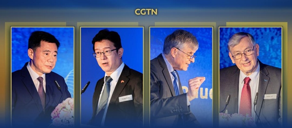 (从左到右)中国驻德国大使吴恳、中国驻法兰克福总领事黄昳扬、德国黑森州国际合作司前司长博喜文、斯洛文尼亚前总统达尼洛·图尔克/CGTN
