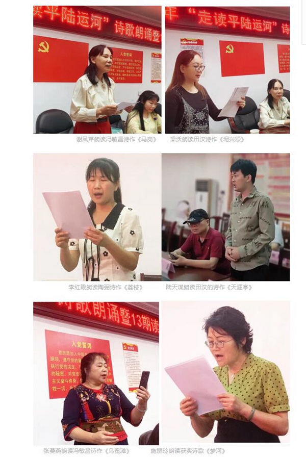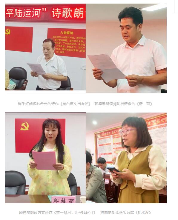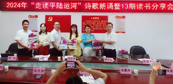 在诗歌朗诵和读书分享会中,来自市县的作家以及陆屋镇干部、学校老师代表30多人齐聚一堂,畅吟古今与今天平陆运河两岸有关的部分诗作,包括唐朝的张说、姜公辅,宋朝的苏轼、陶弼、岳霖,明朝的林希元,清朝的冯敏昌,以及近代的田汉等的诗作。会议由钦州市作协副主席吕岳主持。