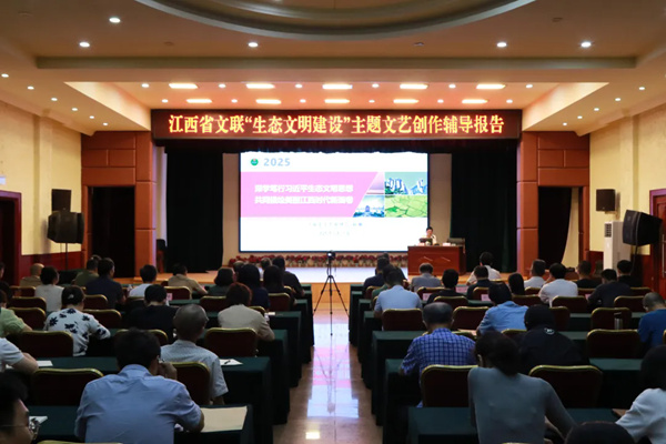 6月17日下午,采风团成员在江西省文联多功能厅参加专题辅导报告会。江西省生态环境厅副厅长级监察专员杨鹏以《深学笃行习近平生态文明思想 共同描绘美丽江西时代新画卷》为题,从领悟习近平生态文明思想的理论伟力、探索美丽江西建设的创新路径、共绘新时代生态文明建设江西篇章三个层面展开系统阐述,为采风团成员把握生态主题创作方向提供了理论支撑与实践指导。