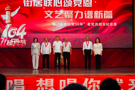 晚会举行为光荣在党50周年老党员颁发纪念章仪式。当一枚枚沉甸甸的纪念章佩戴在老党员们胸前时,观众们以经久不息的掌声向老党员们致敬。