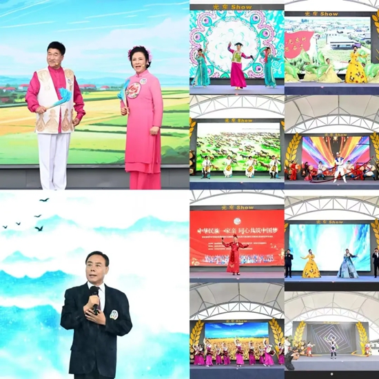 蒙古族歌曲《赞歌献给亲爱的党》唱出各族儿女的共同心声;舞蹈《鼓舞丰年》以欢快鼓点、热烈舞姿,描绘出吉林大地五谷丰登、百姓安乐的幸福图景;杂技《抖空竹》技艺娴熟,演员们腾挪翻转间展现传统技艺的灵动与活力,引来阵阵喝彩;由中国曲协副主席、吉林省文联副主席闫淑平与吉林省二人转协会副主席、秘书长佟长江表演的原创二人转曲目《百姓书记》展现了基层干部与各族群众的鱼水情深,用接地气的表演传递民生温度,引发观众强烈共鸣;舞蹈《同心圆梦》将演出推向高潮,各族演员携手共舞,舞姿中蕴含着“各民族像石榴籽一样紧紧抱在一起”的深厚情谊,诠释着同心共筑中国梦的坚定决心;演出尾声,全体演职人员与现场观众齐声高唱《歌唱祖国》,嘹亮歌声在边疆大地上久久回荡,唱响民族团结的深厚情谊。