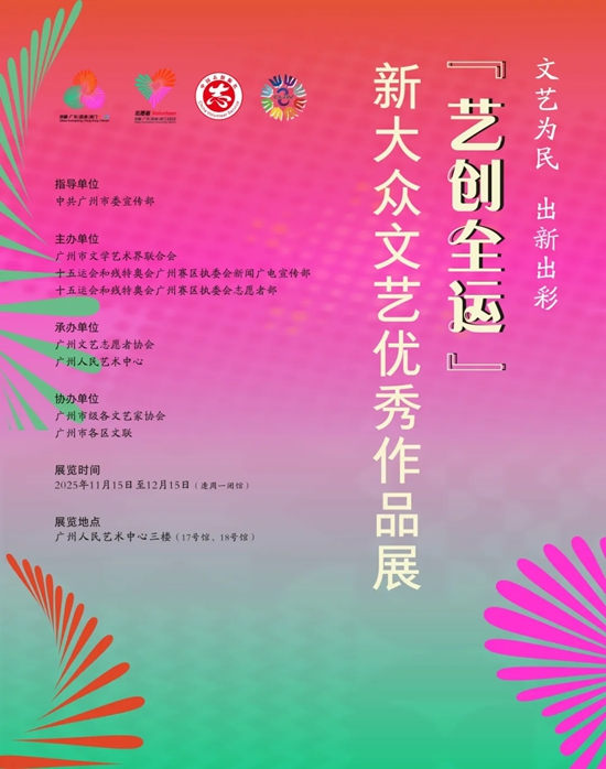 11月15日,在中共广州市委宣传部的指导下,由广州市文联、十五运会和残特奥会广州赛区执委会新闻广电宣传部、志愿者部联合主办,广州文艺志愿者协会、广州人民艺术中心共同承办的“艺创全运”新大众文艺优秀作品展在广州人民艺术中心启幕。