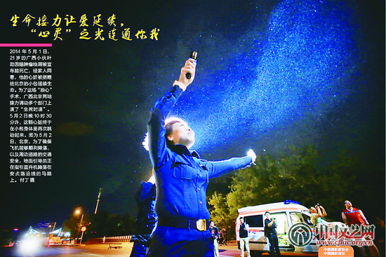2014年5月1日,21岁的广西小伙叶劲因脑肿瘤晚期被宣布脑死亡,经家人同意,他的心脏被捐赠给北京的小包延续生命。为了这场“换心”手术,广西北京两地接力调动多个部门上演了“生死时速”。5月2日晚10时30分许,这颗心脏终于在小包身体里再次跳动起来。图为5月2日,北京,为了确保飞机能够顺利降落,以及周边道路的交通安全,地面引导员正在指引直升机降落在安贞路沿线的马路上。 付 丁 摄