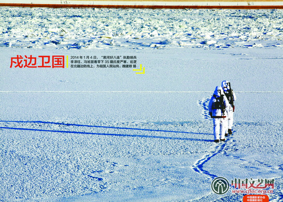 2014年1月4日,“黑河好八连”执勤哨兵李泽钰、冯旭冒着零下35摄氏度严寒,巡逻在北疆边防线上,为祖国人民站岗。魏建顺 摄