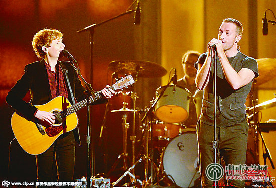 颁奖现场,酷玩乐队与贝克合唱Heart Is a Drum