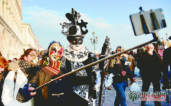 今年的威尼斯面具嘉年华上,人们连“神器”自拍杆都用上了