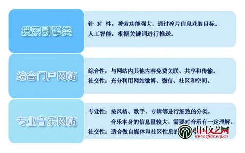 以上三类音乐网站由于其建立音乐网站的出发点不同,尽管在后续发展中相互借鉴弥补了各自的不足,其各自特征依旧明显。