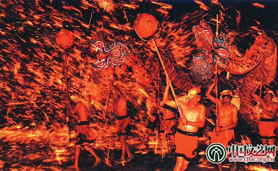 场上,龙头火、龙口火、龙脊火……那“花”都是火。干花是火药花,它形成立柱花;水花则是铁水,用生铁熔化打向空中,铁花要么散落在舞龙人黄云贵汗津津的身上,要么洒向舞龙场中央,满场火星飞溅,红霞漫天,在飞转的火流星与喷发的滚滚黄烟中,火与花与烟雾,一同形成浓烈的火阵,此时,无论老者、小孩,还是男人、女人,无以惧怕。只见舞龙人光头、赤脚、身着短裤,不停地跳跃穿梭于火障之中,俨然人龙勇猛穿越硝烟弥漫、弹飞炮响的战场,真可谓人在火中舞,龙在火中飞,令人惊叹。