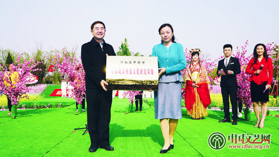 罗杨把“中国成语典故文化研究基地”的牌匾交到开封市副市长孙晓红(右)手中