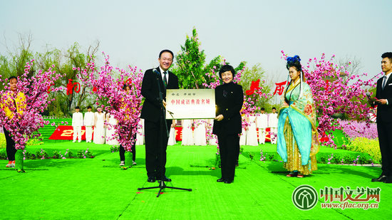 杨承志将“中国成语典故名城”的牌匾交到开封市委常委、宣传部部长王载飞(左)手中