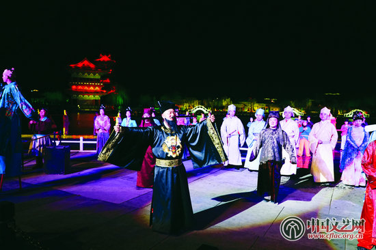 水上巡游演员穿着各色宋服,登御河画舫,巡游的船依次排开,在杨家湖进行船阵表演。