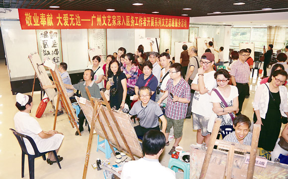 为医务工作者画像、挥毫、拍照、表演节目……前不久,广州市越秀区文化艺术中心上演了一场异彩纷呈、意义深远的文艺盛宴。广州百名文艺家倾情献艺,用自身擅长的艺术形式讴歌广州医疗战线的感人事迹,反映医务工作者救死扶伤的人道主义精神。“白衣天使”们笑容满面,不时与文艺家互动交流,展现医者工作之外的另一面……这是由广州市文联、广州市卫计委共同举办的“敬业奉献 大爱无边”——广州文艺家深入医务工作者系列文艺志愿服务活动的场面。