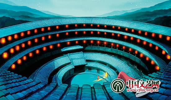 影片的场景选择传统山村居民建筑——福建客家土楼,这种围屋群居建筑是中华儿女团结互助的生活方式的代表,与影片展现的全村人齐心协力对抗洪水之灾的内容遥相呼应,这样的设定不仅确立了影片内容与这种文化的吻合,同时也拉近了观影者与这部动画电影的距离。如影片的女主角椿从土楼里跑出来,撑着油纸伞,提着纸灯笼,穿过“一线天”,通过一条龙头鱼尾的小船,来到灵婆的住所。人物的每一个道具、动作和细节都扩展了东方意境下古风古韵的生活场景。