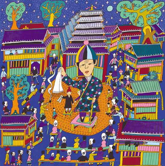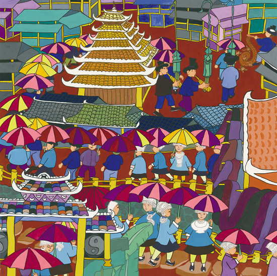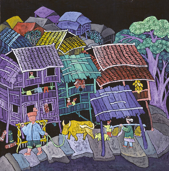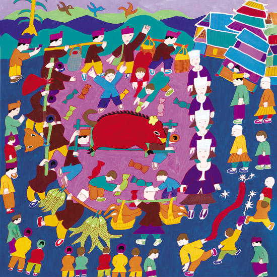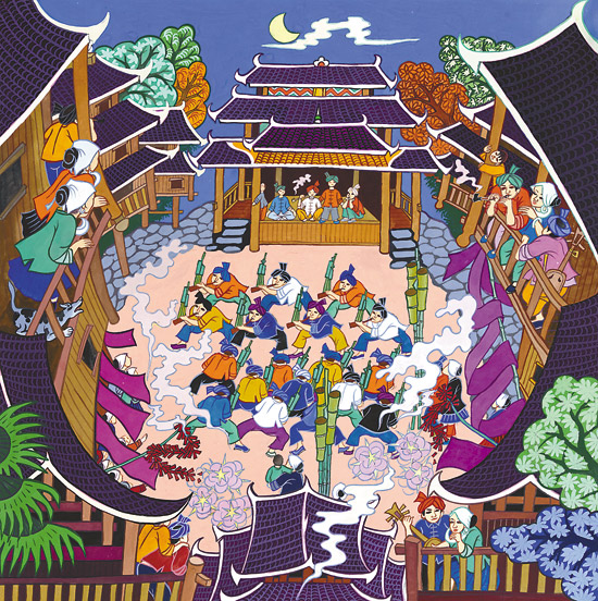 以鼓楼为核心,涵括风雨桥、戏楼、吊脚楼等和谐主题的民俗建筑、民俗风情、生活习俗等文化现象的鼓楼文化,是三江农民画创作的重要题材。侗族“有寨必有鼓楼,有河必有风雨桥”。鼓楼、风雨桥和吊脚楼几乎成为每一幅三江农民画的主题或背景。静静观瞻着一幅幅美丽的画作,目光可以直抵这个崇拜太阳的民族的灵魂深处。譬如《讲款》,形象再现了本寨一众男女老少齐聚于鼓楼坪静听款首讲款的情景。这幅画的作者是独峒乡独峒村的农民杨共国。据了解,他自幼酷爱画画,后因家境贫寒小学未毕业就被迫辍学,但一直难以割舍画画的情结,经常把生活里那些熟悉的事物反复勾画在小学生用过的作业本上。上个世纪80年代三江文化部门在独峒乡举办农民画培训班时,他第一个报名,并在刘克清的指导下,很快脱颖而出。他白天做农活,晚上就着煤油灯昏黄的光晕伏在旧木箱上画画,《讲款》的初稿就是在这简陋的创作环境里,一气呵成完成的。在他的记忆里,这是再熟悉不过的生活场景了。鼓楼经常与寨门和戏台相连,是侗寨最高最雄伟的建筑,被侗族人视作寨胆,称作“寨魂”。鼓楼最早的功能是击鼓报警预防外敌侵扰,后来军事功能弱化,逐渐演变成了每座侗寨真正意义上的政治、文化中心,约定俗成为讲款的教堂。《讲款》这幅画夸张描绘了站在鼓楼坪正中间的桌子上准备讲款的款首,人们从鼓楼附近的吊脚楼里鱼贯而出,如星星般散坐于鼓楼坪四周的长木凳上,近百人的宏大场面,主色调为紫色、蓝色和黄色,彰显了款首的德高望重与该仪式的庄重神圣。我在深入独峒乡独峒村采访时,曾探询过杨共国创作这幅画的初衷,这个不苟言谈的中年汉子搓着两只粗糙的茧手,好长时间才憋出来这么一句:“我只想把我眼里看到的和心里想到的好好地画出来。”这幅画是杨共国的代表作,为他带来殊荣的同时,也改善了他的经济状况。受他的影响,独峒乡不少人开始专注于农民画的绘制,还有人靠卖画盖上了新楼房,杨共国的妻子和儿子也都成了当地画技不错的农民画家。
