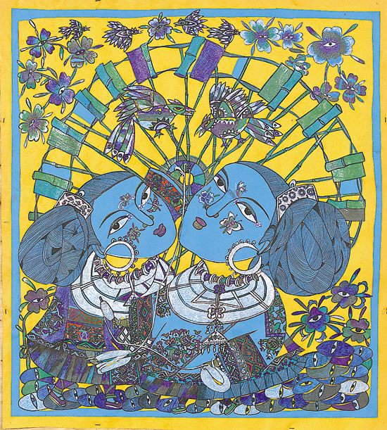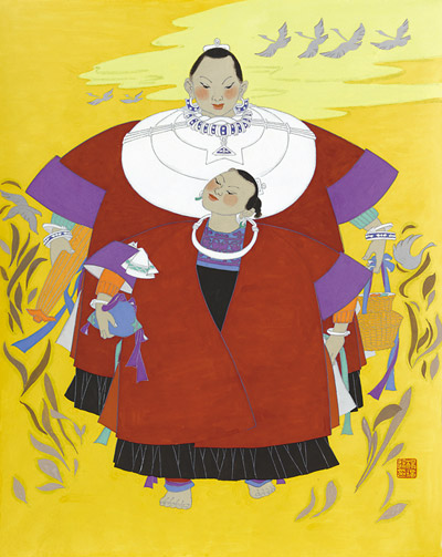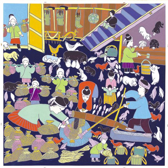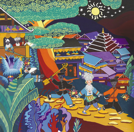 带有浓浓远古遗韵的侗族婚俗,也是三江农民画乐此不疲表现的母题。杨丹的《抢亲之夜》以绚丽多彩的视觉语言述说了这个曾经广泛流传于独峒乡一带的古老婚俗。但见画面中一侗族新嫁娘娇羞满面,身裹喜庆嫁衣穿过寨门旁的古榕,被面涂锅灰的新郎和伴郎“挟持”夜行于石板路上。一伴娘掩藏于吊脚楼旁青翠的芭蕉树后,伸手欲夺新郎手中的琵琶,另外两伴娘则倚窗高挑彩灯手扬侗帕,为被成功抢走的新娘送行,并高歌祝福这对有情人终成眷属。《出寨门》则是罗耘对林溪乡程阳八寨婚俗的美丽再现。这幅作品是他根据自己正月初二亲眼目睹的婚礼场景创作的。三个翩翩走出寨门的妙龄女郎中,前两个是伴娘,后一位是新娘。精美的银饰,衬托着她们神仙般的花容月貌和新婚的喜悦。她们均手持芦笙,芦笙上插一碧绿枝条。不同的是新娘手中还紧紧攥着一方手帕,里面包裹着娘家人赠与的礼金。寨门两旁画有八卦图案,飞檐上饰有跃鱼,两棵风水树对称排列,拱护着寨门,花儿静美绽放,隐喻着侗寨有女初长成,正是适婚的芳龄。侗家人个个能歌善舞,一曲曲荡气回肠的山歌,成为这里各年龄段的人们社交生活里不可缺少的礼物,被三江农民画家反复讴歌。杨清利的《侗族大歌》、梁治荣的《赛芦笙》、吴凡宇的《侗家芦笙踩堂舞》、杨贤考的《木叶歌》等作品主题鲜明地描绘了侗家人的载歌载舞,倾吐了他们对美好幸福生活的追求。另外,杨庆谊的《舂米》、陈玉秋的《理纱》、吴述更的《捶年粑》、杨功存《打鱼归来》、杨基艳的《晒谷子》等作品,生活气息浓郁,原生态地再现了侗家人生产生活里的辛勤劳作和喜悦。