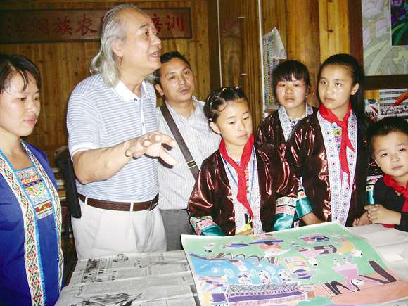 广西美协主席谢麟在三江独峒乡指导农民画传承人进行创作
