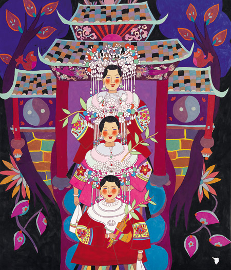 柳州市三江侗族自治县,宋时置县,位于广西壮族自治区北部湘、黔、桂三省(区)交界处,因流经境域的榕江、浔江和融江而得名。这里侗族人口过半,是一个山清水秀、民风古朴的多民族聚居的人间福地。这里有多项令世界瞩目的非物质文化遗产:侗族大歌恍若天籁之音,侗族建筑文化——木质结构建筑技艺精妙绝伦……当我流连忘返于那古香古色的风雨桥、鼓楼和吊脚楼,沉醉于那享誉世界的侗族大歌和异彩纷呈的民俗节日盛宴时,一种侗族人纯手绘的美丽画作,如山间盛开的野花,不断映入眼帘。这,就是柳州市三江侗族农民画。这种造型拙朴富有装饰美感的民间艺术品,几乎囊括了整个三江的自然人文景观和侗家人的生产生活百相,传统的民族审美意识与现代审美意蕴相融合,传承和传播着侗族的历史与文脉,独秀于中华民族民间艺术之林,成为隐藏在大山深处的当代侗家人的浮世绘。