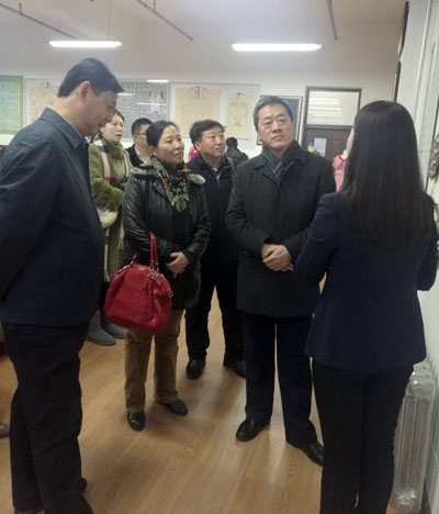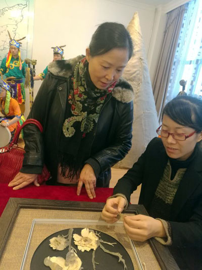 中国民协副秘书长周燕屏(图左一)调研佳木斯职教集团赫哲族鱼皮画传承制作技艺。伊红梅/摄