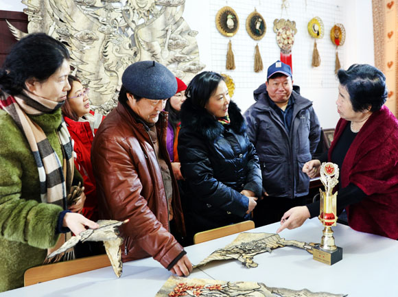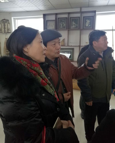 中国民协考察服务团走访全国首届山花奖金奖获得者、赫哲族鱼皮画传人刘升(图右一)。计世伟/摄