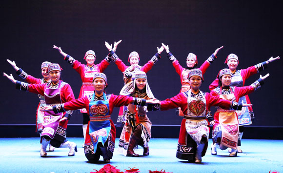赫哲族的女儿——齐艳华等在同江非遗研究中心表演赫哲族舞蹈。计世伟/摄