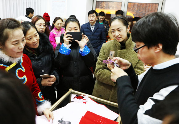 中国民协文艺志愿服务团青年剪纸艺术家刘卓现场演示并传授剪纸技艺。计世伟/摄